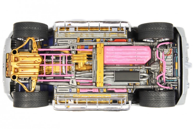 Nachdem ich den Unterboden fertiggestellt hatte, habe ich die Karosserie grau lackiert, mit silbernem Dekorspray übernebelt und anschließend dreimal mit Klarlack lackiert. So entstand eine Art schimmernder Effektlack.