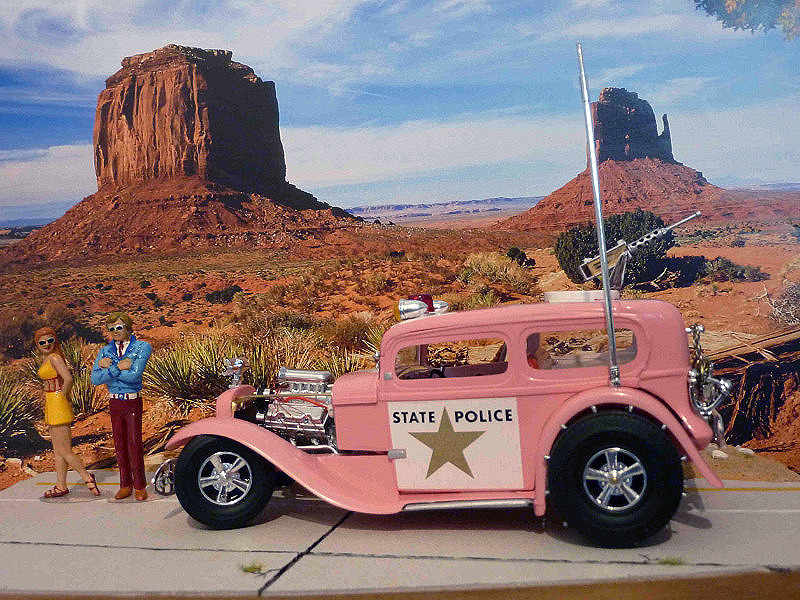 Das ModellAurora hatte 1969 eine Serie von 6 Hot-Rods im Maßstab 1/32 im Programm. Es sind so ziemlich die verrücktesten Designs, die ich kenne. Nur Monogram hatte ähnliche Modelle in 1/24 im Handel. Man fragt sich unweigerlich: Gab es solche Fahrzeuge in den USA wirklich, oder haben die Modellbauer zu viele Drogen konsumiert? Wer kommt auf die Idee am Heck des Fahrzeugs zwei Bärenfallen aufzuhängen? Ein Motorrad auf das Trittbrett zu stellen? Einen Radarwarner auf den Kühler zu setzen? Wozu sind diese Spikes auf den Hinterrädern?