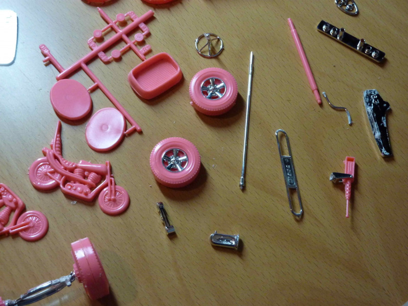 Der Bausatz besteht aus 69 Teilen. Bereits in Pink eingefärbt, beinhaltet der Kit Chrom und Glasteile. Zwei Figuren im Sixty-Style sind immer dabei(sie heißen laut Bauplan Harley und Angel). Die Passgenauigkeit ist für das Alter in Ordnung. Die Bauanleitung lässt allerdings Fragen offen, die nur durch Anpassungen geklärt werden können. Wie früher auch bei Revell üblich lag eine deutsche Übersetzung bei: „Klebe Teil 4 an Teil 5…“ usw. Die hilft aber nicht wirklich viel. Der Motor bekam noch Zündkabel und der Kühler Gummischläuche. Die riesige Antenne habe ich beibehalten: Kultig! Der Abziehbilder-Bogen war schon leicht angegilbt, aber zum größten Teil noch brauchbar. Leider waren auf den Decals die Sterne verkehrt herum gedruckt, so dass ich die beigelegten Alternativen verwendete. Wie schon gesagt-es waren die wilden 60er Jahre…