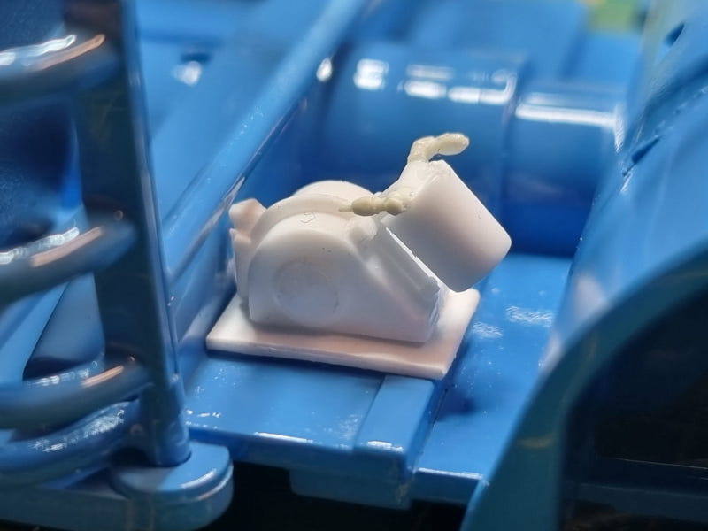 Der Blendschutz im oberen Bereich der Windschutzscheibe wurde entfernt, sämtliche Spalten und Sicken mit einem Gravierer nachgezogen. Die Haubenverschlüsse wurden entfernt und später mit Fotoätzteilen neu erstellt. Das Resin muss nach dem Druck gründlich gereinigt werden. Dafür verwende ich Isopropanol und unter UV-Licht wird das Bauteil für bis zu 120 Sekunden nochmals durchgehärtet. Als Primer verwende ich Produkte entweder von Zero Paints oder von Tamiya. Der Lack ist ein selbst gemischter Farbton der Firma Mipa. Als Decals verwendete ich einen Satz von Mikes Decals aus den USA, anschliessend 2k Klarlack von Zero Paints. Als Chassis verwendete ich das des Richard Petty Charger 1973 von Salvino JR, das anhand von Orginalfotos im Motorbereich und im Innenraum modifiziert wurde. Das Fahrwerk wurde geringfügig verändert und verbreitert und die Reifen verwendete ich aus einem 1:24er Kit, da diese stimmiger wirken. Einige Teile dieses Modells fertigte ich selbst entweder scratch von Hand oder im 3D-Druckverfahren selbst an. Der Fahrersitz entstand komplett scratch und lackiert wurde das Muster mit Hilfe eines Meshs, das ich passend zugeschnitten auf die zu lackierenden Flächen aufgelegt habe. Zuerst Weiß mit der Airbrush aufgetragen, nachher bei eingelegtem Mesh Schwarz darüber gesprüht und fertig ist das Muster. Im Motorraum wurde bis auf den Motor fast alles selbst hergestellt, der Rahmen im Motorraum komplett scratch mit Hilfe von Evergreen-Profilen. Hier kam sehr viel Konstruktionsarbeit im 3D-Verfahren zum Zuge, die Teile wurden dann mit dem 3D-Drucker hergestellt. Kühler, Ausgleichbehälter, Wasserbehälter, Zündverteiler, Bremsflüssigkeitsbehälter, Batterie und Öltank wurden auf diese Weise gebaut. Auch die sehr kleinen Haubenhalter sind so ohne Probleme zu produzieren. Die Verkabelung, Verrohrung, die Ölleitung sowie die Kabelbänder sind aus dem Fundus diverser Detailhersteller (Detailmaster, Scale Production). Die Kühlerabdeckung, Luftführung und die aufgesetzten Teile unten an den hinteren Seitenfenstern entstanden aus echtem 0,3 mm Alublech.