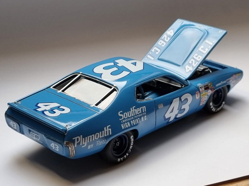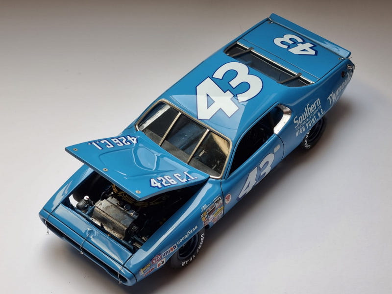 Seit meinem letzten Arbeitseinsatz 2019 in den USA bin ich gefangen in der Welt der NASCAR. So machte ich mich an einem freien Tag auf den Weg nach Daytona, um selbst einen NASCAR im Oval spüren zu können. Seit dem lässt mich das Interesse daran nicht los. Durch Zufall kam ich auf den noch neuen Hersteller von NASCAR-Kits, Salvino JR Models aus Kalifornien, zu dem ich mittlerweilen auch privaten Kontakt habe. Nachdem ich schon ein paar Modelle dieses Herstellers gebaut hatte, fand ich im 3D Printable Shop in einem bekannten sozialen Netzwerk eine Karosserie des berühmten Richard Petty Roadrunner Daytona 500 Racewinner von 1971. Da ich mich jetzt seit ein paar Jahren mit dem 3D-Druck beschäftige, reifte die Idee ein Modell zu bauen, das es bis jetzt noch nicht so gab. Natürlich gab es den schon als kompletten Kit von MPC vor etlichen Jahren, aber die Details und die Orginalität waren da nicht gegeben. Nach dem Download der Datei und dem 3D-Druck der Karosserie im gewünschten Maßstab stand sofort fest, dass einiges getan werden musste, um mein Ziel zu erreichen. So wurden ein paar Details geändert, um möglichst nah ans Orginal zu kommen. So musste unter anderem die Motorhaube ausgeschnitten und modifiziert werden. Das Ziel war, dieses Biest mit geöffneter Haube und detailliertem Motorraum darzustellen.