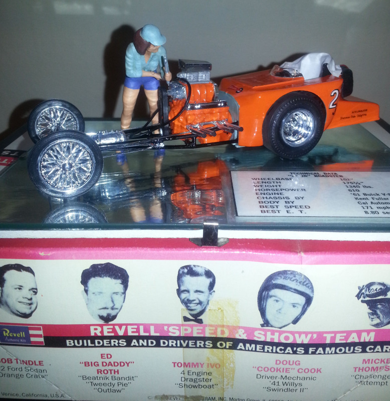 Bei dem Bausatz handelt es sich um einen Revell-Kit aus den 80ern: der Tony Nancy Roadster 1962, von Revell als Bausatz erstmals 1963 herausgebracht. Ich habe das Modell auf einen rahmenlosen Bilderhalter kleben müssen, weil das Rohrchassis sehr fragil war.