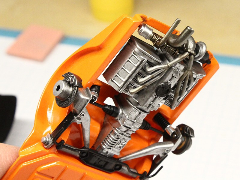 Eine volle Motornachbildung enthielt der Bausatz nicht, es ist ein typisches "Curbside"-Modell mit angegossener Motornachbildung unten am Chassis, hier kann man allerdings mit geschickter Bemalung einiges rausholen. Die Wände des Auspuffrohres habe ich dünner geschliffen. Die "nagelneuen" Reifen mit der Gussnaht in der Mitte wurden durch Abschleifen in einen "gebrauchten" Zustand gebracht. Der "Dunlop"-Schriftzug ist aus einem Aftermarket-Decalset.