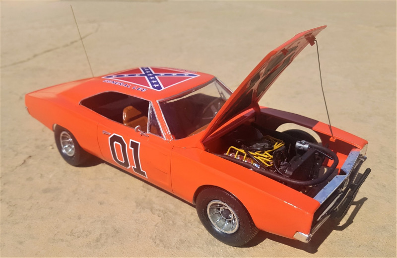 Der Bausatz ist ein alter Kit von MPC im Massstab 1:16. Ich habe mich nie für Automobilbausätze interessiert, so dass der Bau für mich völliges Neuland war. Bei der Recherche habe ich festgestellt, dass es nicht den “Einen” General Lee gibt. Durch die vielen Stunts sind die jeweiligen Fahrzeuge zu Bruch gegangen, so dass im Laufe der Zeit 309 Charger Gebrauch fanden. So habe ich mich an die Bausatzvorlage gehalten und den Kit Out Of The Box gebaut. Der Motor ist schön detailliert und auch aus dem Fahrzeuginneren lässt sich mit etwas Farbe und Scratchbau etwas machen. Da die orange Lackierung des Chargers zusammen mit der Konföderiertenflagge auf dem Dach das Erkennungsmerkmal ist, habe ich mich bemüht, diese so authentisch wie möglich zu gestalten. Das Decal für die Fahne ist leider gerissen. Glücklicherweise ließen sich die Teile aber wieder zusammenfügen.