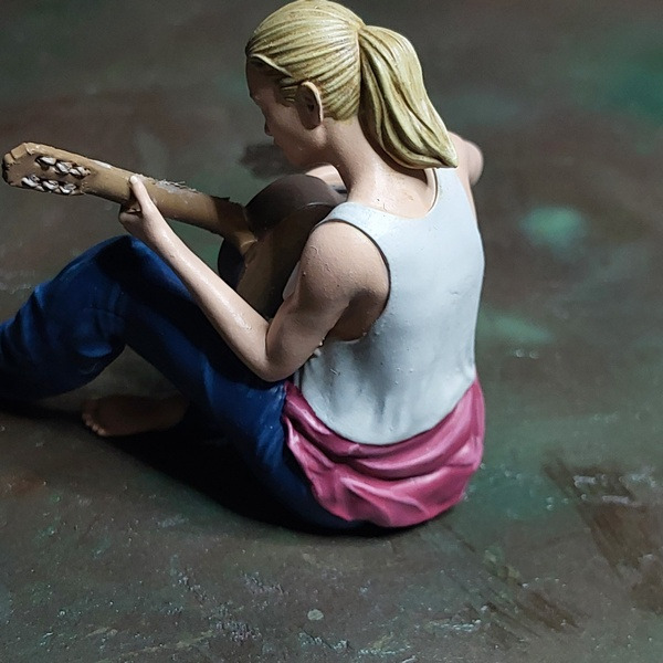 Als Inspiration für die Frau vor dem Bus diente mir das Bild Psylvia von Bill Eppridge aus der The Life Picture Collection. Dabei hielt ich mich nicht zum 100% an die Vorlage; ich ergänzte noch den Blumenkranz, um den Hippielook zu vervollständigen. Den Blumenkranz zwirbelte ich aus Draht und klebte Sonnenblumen (1:87) aus dem Modelleisenbahnbedarf drauf.