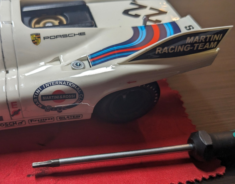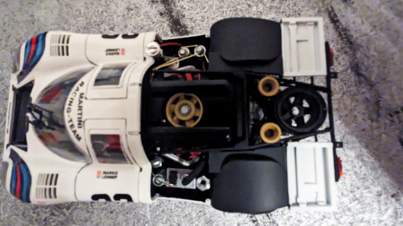 Vom Bauumfang bzw. von den Details hätte ich mir mehr erwartet, wie z.b. die Renngurte im Fahrersitz, die hab ich mir zusätzlich von Tamiya geholt, die gab es in verschiedenen Ausführungen, Rot, Blau usw. Auch vom Motor-Ausbau, diesen hätte ich detaillierter erwartet, und hab mir an Hand vom Internet was zusammengebaut. Da musste ich mir auch was einfallen lassen, wie man sieht an Hand der Bilder, sollte die Haube zum Motorraum abnehmbar sein, um das Innere bewundern zu können. Hoffe, dass ist mir etwas gelungen. Ansonsten hat es Spaß gemacht, an dem Modell zu arbeiten, wo es auch so viele Ausführungen gibt von dem Porsche 917k wie z.b. mit Lufthutzen/ohne Lufthutzen, großen Spoiler/kleinen Spoiler, Glasdach/kein Glasdach... Wahnsinn!