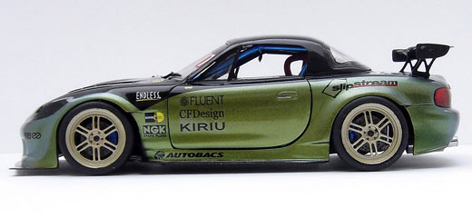 Dieses Modell baute ich für einen Online-Wettbewerb. Das Thema war für mich sofort klar: Time Attack auf der Rundstrecke. Hierzu waren tief greifende Umbaumaßnahmen von Nöten. Also erst mal den Schwerpunkt senken. Dazu schnitt ich die Kotflügel aus und setze sie 2mm höher an, um das Auto noch näher zum Boden zu holen. Die inneren Radkästen schnitt ich komplett aus, außen fertigte ich Verbreiterungen aus Sheet-Bögen und Tamiya-Spachtel an. Ferner wurde die gesamte Karosserie überarbeitet, auf der Motorhaube wurden selbst gefertigten Kiemen angebracht (auch eine Premiere). Unter der Motorhaube befindet sich ein selbstgebauter Wankel-Motor. Die Türen wurden ausgesägt und beweglich wieder angebracht. Dabei brachen die Streben der Windschutzscheibe, was den Umbau weiter verzögerte. Zur Gewichtsersparnis wurden die Türverkleidungen gegen Abdeckungen aus Carbon ausgetauscht.