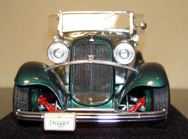 Das Modell habe ich im Prinzip OOB ohne große Veränderungen gebaut. Lediglich ergänzt habe ich einige Details, wie den einzelnen Scheibenwischer, den Außenspiegel, zwei kleine Zusatzscheinwerfer, den verchromten Tankdeckel und das zusammengelegte Verdeck. Der Scheibenwischer ist scratch built, während das Verdeck von einem Monogram Packard Oldtimer stammt. Außenspiegel, Zusatzlampen und den Tankdeckel spendete eine noble Buggatti Royal 1:24 Verkleinerung von Italeri. Why not!?