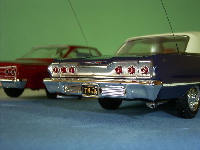 Das ModellDas Revell-Modell kann, wie viele andere Impala-Bausätze auch, entweder als Serien- oder Lowridervariante gebaut werden. Für mich kam allerdings wie immer nur die Serienversion in Frage, weil ich es nicht ausstehen kann, wenn die schönen Autos mit furchtbaren Chromfelgen, Niederquerschnittsreifen und anderem Schnickschnack verschandelt werden. Dargestellt ist ein Sport Coupé mit SS-Ausstattung und 327er V8. Als Lackierung habe ich die "two-tone option" Daytona Blue/Ermine White zum Vorbild genommen und wie immer anhand von Ditzler-Farbchips angemischt; wobei das Weiß hier schlichtes Humbrol Glanzweiß ist. Auch bei diesem Wagen konnte ich nicht widerstehen, ihm meine Lieblingsinnenraumfarbe Rot zu verpassen. Seidenmattrot simuliert das leicht glänzende Vinyl der Super Sport-Polsterung, während rote Viskosefasern den Teppich darstellen. Als kleinen Showeffekt hat dieser Impala die Sonderausstattung "dummy left rear antenna", also eine völlig funktionslose Antenne auf dem hinteren linken Kotflügel, die einfach nur gut aussieht und sonst nichts.
