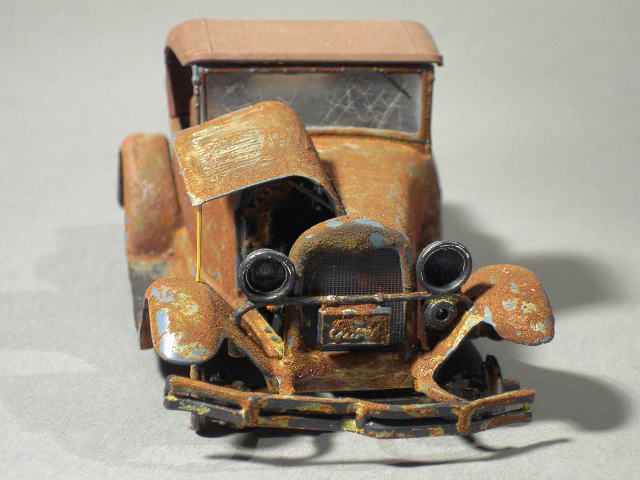 Nach dem "Rost-Käfer" war dies der zweite Bausatz, an dem ich den Zwei-Komponenten-Rost der Firma „Modern Options“ ausprobierte. Grund hierfür war ein Besucher auf einer Modellbauausstellung. Er plante ein ähnliches, größeres Diorama wie ich es mit dem Käfer auf relativ kleiner Fläche verwirklicht hatte. Er präsentierte mir den Bausatz des 1929 Ford Station Wagon und fragte mich, ob ich dieses Modell als Pick-Up ähnlich verrostet für ihn bauen könnte. Ich nahm diesen Auftrag an und hier ist das Ergebnis: Da Fahrzeuge in 1:25 eigentlich nicht zu meinem "Beuteschema" passen, war ich über die Fülle der Einzelteile überrascht. Nachdem ich alle nicht benötigten Teile für die Station-Wagon- und die Customs-Version auf Seite legte, war der Karton schon wesentlich aufgeräumter. Die Montage nach Bauplan verlief für mich problemlos. Besonders schön detailliert empfand ich den Motorblock. Da man ihn bei aufgeklebter Verkleidung nicht mehr gesehen hätte, trennte ich eine Hälfte ab und schliff diese auf ein realistisches Maß dünner. Die Kabine und Sitzbank verschmutzte und alterte ich in ähnlicher Weise wie den Käfer. Die Windschutzscheibe ließ ich diesmal in einem Stück und verkratzte sie lediglich. Scheinwerfer, Stoßstange und weiter Teile wurden auch auf "alt" getrimmt. Reifen und Felgen habe ich auch nicht montiert. Diese hätte der Auftraggeber bei Bedarf noch nachträglich montieren können.