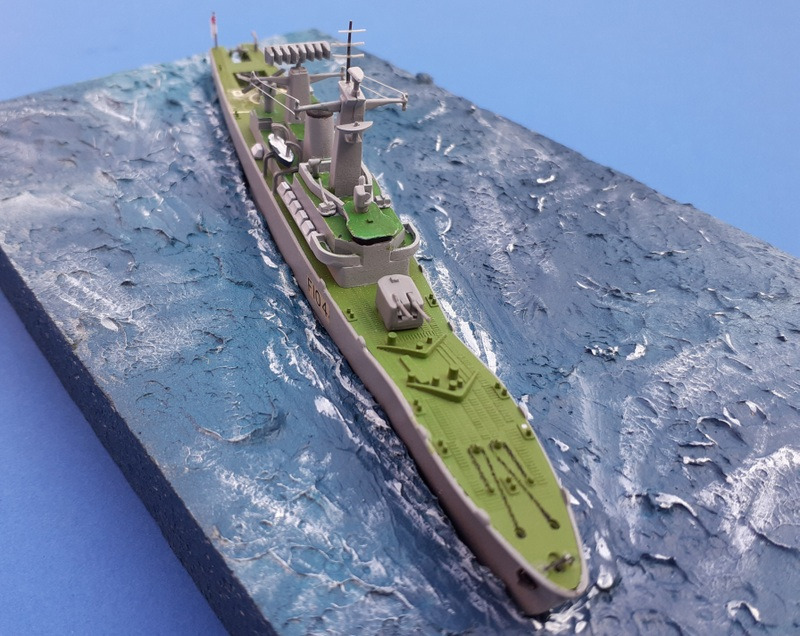 Zum ersten mal überhaupt habe ich mich an der Erstellung einer "Wasserfläche" gemacht, um das Schiff schwimmend darzustellen. Eine Styroporplatte wurde auf Maß geschnitten und mit Strukturpaste eingestrichen, so dass eine Art Wellen enstanden. Anschließend habe ich den Rumpf eingepasst und die "Wasserfläche" in verschiedenen Blautönen bemalt, sowie die Wellen mit weißer Schaumkrone versehen. Der Bausatz bietet die Möglichkeit, drei verschiedene Schiffe der Leander-Klasse zu bauen: HMS Leander, HMS Arethusia und HMS Dido, die 1982 am Falklandkrieg teilnahm, weshalb ich mich für diese entschied.