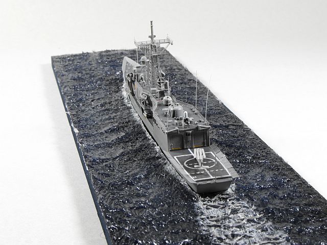 Zur Modifizierung verwendete ich den PE-Satz 700-10 von GMM, der alle wesentlichen Teile für die PERRY-Klasse beinhaltet, einschließlich Relings in feiner Ausführung. Da mir die beiliegenden Decals von Dragon als zu dick geraten erschienen, verwendete ich Abziehbilder aus dem Programm von JAG und GMM. Nur das Decal für das Heili-Deck wurde dem Bausatz entnommen, da es dem Original nahe kommt. Lackiert wurde das Modell mit bewährten Farben aus dem WEM-Colorcoats-Programm. Zur Anwendung kamen Haze Grey, sowie aufgehelltes Deck Grey für die moderne US Navy. Gealtert wurde das Modell mit Künstlerölfarben, sowie Pastellkreide, die ich allerdings erst nach dem letzten Klarlackauftrag aufbrachte. Eine Styrodurplatte diente als Grundlage für das Display, das Meer wurde nach der Silikon-Methode modelliert, der Untergrund mit Plaka-Farben bemalt.
