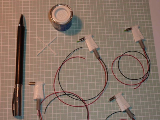 Die Motoren haben 4 mm Durchmesser und werden mit 1,5V über einen eigenen Fahrtenregler angesteuert. Die Pods sind beweglich wie die Ruder auch, haben aber keinen Servo erhalten. Irgendwann muss auch mal Schluss sein. Die Beleuchtung besteht bei mir nur noch aus LEDs, ich brauchte noch nie eine ersetzen. Auch die winzigen Positionslampen und die Topplaterne kann man bei einem Elektronikhandel bekommen. Der ganze Kabelbaum geht dann unter das Boot in die Auftriebsbox. Diese ist eigentlich ein Schiffchen für sich und beinhaltet alle RC Komponenten wie Empfänger, zwei Fahrtregler, Servo, Motor und Akku. Zugeklebt über einen Deckel ist sie wasserdicht und es schauen nur die vier Kabel zur Beleuchtung und zu den Motoren heraus. Der Bausatz selbst ist dann nur noch wie ein Dummy aufzusetzen und los geht's übers Wasser mit Hilfe einer schlichten Schiffsschraube...und ich weiß, was sich jetzt jeder fragt: Kann sich das Hovercraft auch nur mit den Propellern bewegen...? Nein, dazu sind die schmalen Propeller zu schwach. Übrigens: Das schöne Deckelbild macht sich inzwischen sehr gut in einem Bilderrahmen an meiner Bürowand!