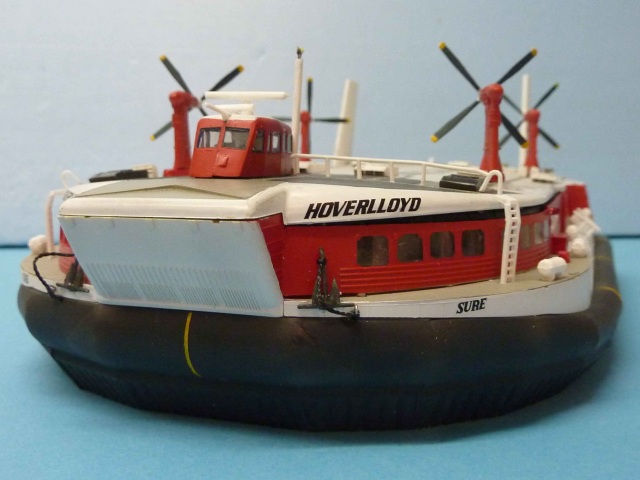 Der Bausatz und das Original haben mich schon lange fasziniert, hatte ich doch die Gelegenheit 1990 mit dieser Hoverlloyd-Fähre den Kanal zu überqueren. Ab 1968 wurde der Pendelverkehr über den Kanal von Ramsgate nach Calais aufgenommen. Zunächst waren es vier, später dann sechs Fahrzeuge. Jeweils die Hälfte wurde in den Farben von Hoverlloyd und die anderen von der British Rail Tochter Seaspeed betrieben. Mit einem Maximalgewicht von 320t schaffte es eine Fähre den Rekord für eine Kanalüberquerung auf bis heute unerreichte 22 min zu drücken! Nicht ganz unschuldig daran waren die vier RR-Turbinen mit einer Einzelleistung von 3400 PS. Trotz Kostendeckung wurde der Verkehr im Jahr 2000 aufgrund von Ersatzteilproblemen eingestellt.