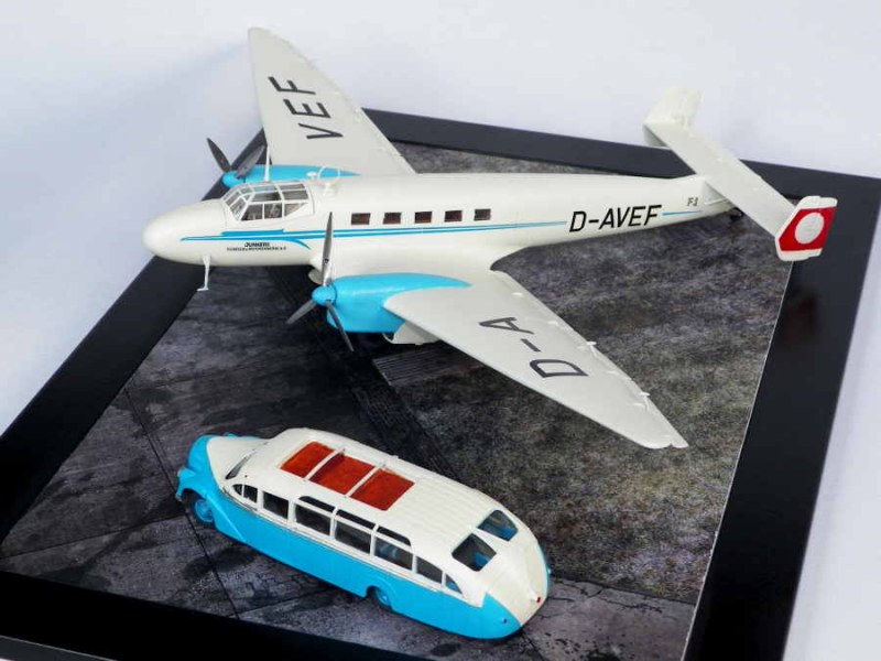 Das ModellDas Modell entstand aus dem alten bekannten Italeri-Bausatz. Einen entsprechenden Farbton zu finden, war gar nicht so leicht, ich wollte nicht mit großen Mischungen anfangen. Bei Vallejo ModelColor bin ich dann fündig geworden: 70.918 Ivory und 70.844 Deep Sky Blue. Auch der Lack stammt von Vallejo. Kennung sind Decals von Fantasy Printshop, Rumpfstreifen von KORA, Schriftzug unter der Kabine selbstgedruckt. Bei den Reisemaschinen hatte ich mir in den Kopf gesetzt, jeweils einen Bus dazu zu bauen. Hier entschied ich mich für den Opel Blitzbus Ludewig "Aero" (1937). Der Bausatz stammt von Roden. Farblich habe ich den Bus natürlich dem Flugzeug angepasst, ist also nur meine Interpretation und wird so sicher nie durch die Botanik gefahren sein.