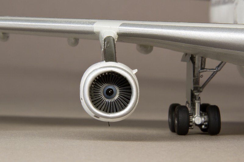 Während ich die Nase und Triebwerkspylone unberührt ließ, habe ich Öffnung der Triebwerke aufgearbeitet, die Winglets wurden von mir selber erstellt. Der Bau lief durchwachsen ab, durch den Ätzteilbogen von Extratech wurden durch Triebswerksschaufeln, Fahrwerksklappen, Bremsscheiben und Scheibenwischer aufgewertet. Antennen, Static Discharger, Treibstoffablassventile, Luftleitbleche an den Triebwerken, sowie die komplette Sensoren musste ich selber bauen. Die Decals stammen von Authentic Airliner Decals.
