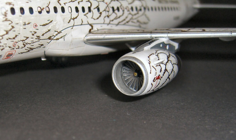 Die bei diesen sonderlackierten Maschinen ausnahmsweise grauen Walkway-Markierungen auf den Traglächen wurden aus entsprechenden Decalstreifen von TL-Decals zusammengepuzzelt – immer schön zwischen dem weißen Gefieder getrennt... Cockpit- und Kabinenfenster sowie Türrahmen stammen von Authentic Airliners. Weitere Bilder