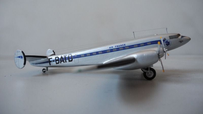 Der Ersteinsatz der Air France-Maschinen erfolgte ab dem 28. Mai 1946 zunächst auf der Strecke zwischen Paris und Algier, später folgten Strecken innerhalb Europas. Nachdem sich Probleme mit dem Antrieb und dem Fahrwerk ergeben hatten, wurden die Flugzeuge im Oktober abgestellt und ab 1947 mit neuen Motoren und der neuen Bezeichnung SE.161.P7 wieder in Dienst gestellt. Die Nachrüstung mit einer Enteisungsanlage und einer Kabinenheizung machte sie erstmals wintertauglich. Der Einsatz erfolgte von nun an auf innereuropäischen Strecken. Aus Wikipedia, wo man auch die technischen Daten nachlesen kann. Die F-BATD wurde von 1946 bis 1954 von der Air France verwendet, 1956 an die spanische Aviaco verkauft, die sie als EC-ANQ einsetzte. Wenn man der Übersicht auf https://asn.flightsafety.org/asndb/type/s161 glauben darf, war sie eine jener glücklichen Languedocs, die in keinerlei Unfälle verwickelt war. Mein ModellMein Modell entstand aus einem Resinbausatz von F-RSIN, und das ist auch schon wieder ein paar Jahre her. Wer die frühen F-RSIN-Bausätze kennt, weiß, dass es da einige "Unwägbarkeiten" gibt: Die Teile und die Bauanleitung. Letztere hat mich dazu verleitet, die beiden Hauptfahrwerke verkehrt herum einzubauen, also achterne Teile nach vorne. Und das verwendete Loctite hält auch nach vielen Jahren noch so fest, wie es die Werbung verspricht. Die Form der Seitenleitwerke sieht auch anders aus als auf den jetzt im Internet angebotenen Bildmaterial. Die Antennenanlage dürfte auch öfters modernisiert worden sein, die von mir dargestellte ist ein eher früher Zustand.