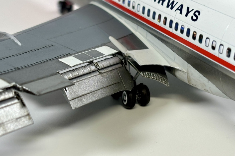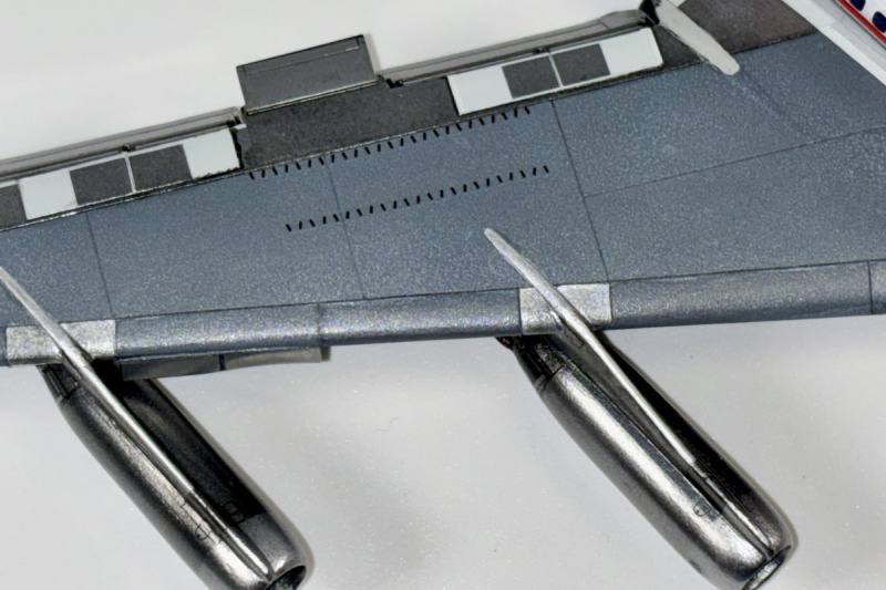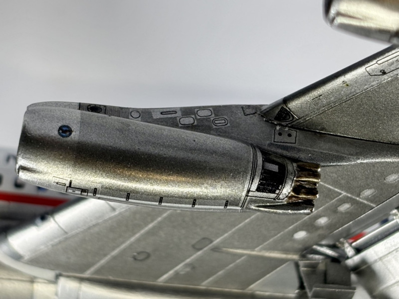 Lackiert wurde überwiegend mit Mr. Paint und Ammo of Mig Acrylfarben. Ein kleines Malheur ist mir an den Triebwerkspylonen passiert: Die Grundfarbe war Ammos Steel, darauf kamen Decals für die Wartungsdeckel und anschließend Mr. Paint Glossy Varnish. Letzteres hat die unbedeckte Acrylfarbe deutlich abgedunkelt, wodurch die Pylone nun leicht „würfelig“ im Finish wirken. Die Decals der Livery stammen von Flying Colors. Der Druck ist wirklich hervorragend, allerdings waren die Decals altersbedingt bereits brüchig. Trotz Versiegelung des Trägerbogens mit Klarlack sind insbesondere die großen blauen und roten Bereiche an der Flugzeugnase gebrochen. Hier musste ich mit Farbe, Schleifpapier und Decalresten nacharbeiten, was jedoch nicht vollständig perfekt gelungen ist.