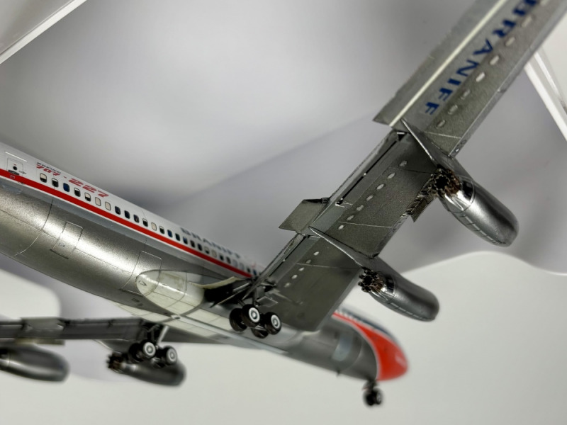 Der neue X-Scale-Bausatz macht einen durchweg guten Eindruck: schöne Details, präzise Gravuren und eine stimmige Form. Einziges Manko ist meiner Meinung nach das Fahrwerk, das etwas schwach detailliert wirkt. Die Räder sehen nicht besonders realistisch aus, die Schächte sind schlicht, und die Fahrwerktüren sind zu dick dargestellt. Ich habe die Räder daher vom Roden-Bausatz übernommen, den Rest des Fahrwerks habe ich so belassen und akzeptiert. Um die 707-227 realistisch darstellen zu können, musste ich mir ein paar Lösungen einfallen lassen, da keine JT4A-Triebwerke verfügbar waren. Authentic Airliners hatte einmal welche für eine 707-Variante im Sortiment, diese waren jedoch vergriffen. Daher habe ich die JT3C-Triebwerke des Roden B720 modifiziert. Als JT3C wären sie deutlich zu groß, als JT4A passen sie jedoch in den Dimensionen recht gut. Hier war viel Spachtel- und Schleifarbeit nötig, um die charakteristische bauchig-runde Form zu erreichen. Mit dem Ergebnis bin ich zufrieden. Wie so oft habe ich für die Klappen wieder auf Laci Flaps zurückgegriffen. Am Heck habe ich noch kleinere Anpassungen am Ruder vorgenommen, das verlängert werden musste, da X-Scale das frühe, kurze Heck darstellt. Für die allererste Variante wäre das korrekt gewesen, doch kurz nach Einführung der 707 wurde das Ruder aufgrund von Stabilitätsproblemen im Flug nach oben verlängert und zusätzlich unter dem Rumpf eine „ventral fin“ nachgerüstet, was ich optisch einfach ansprechender finde.