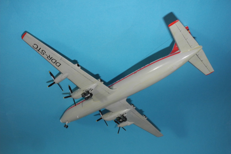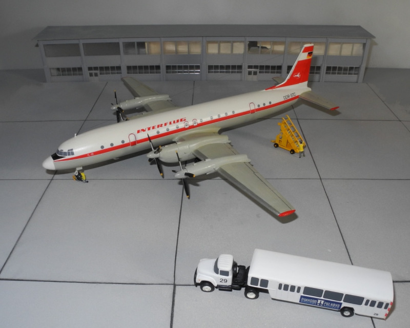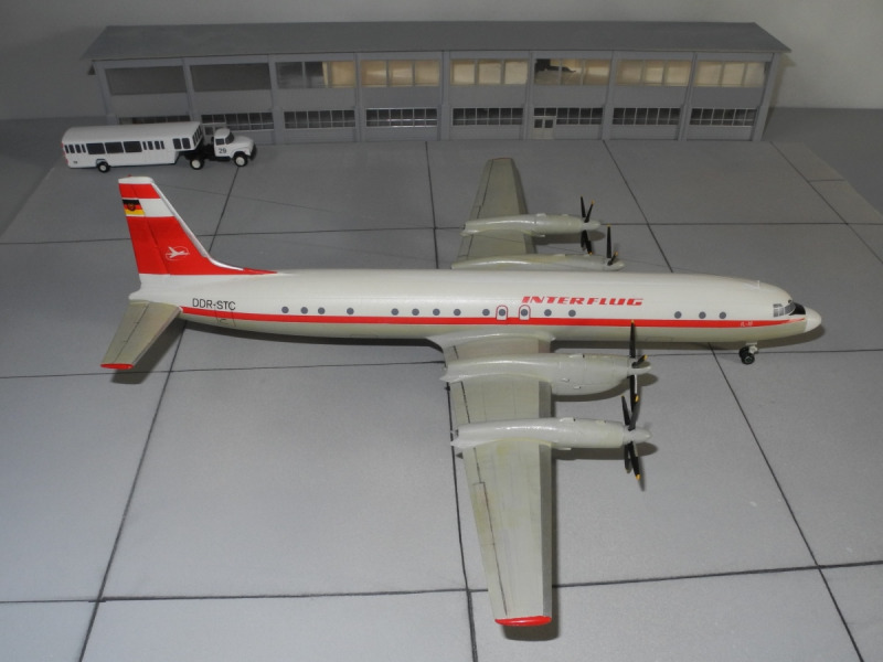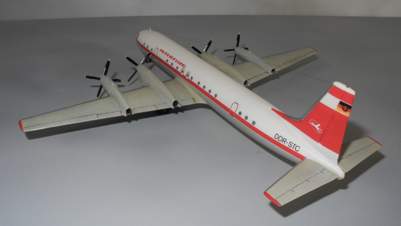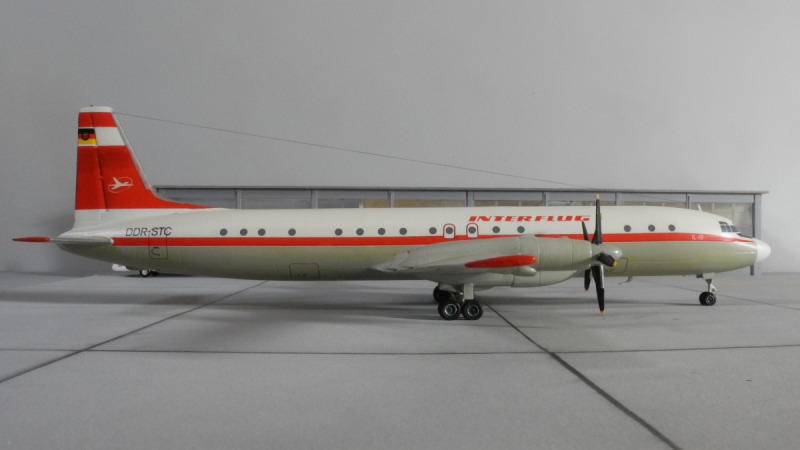 Iljuschin Il-18WDDR-STC, Interflugvon Johannes Wipauer (1:144 AZ model)Zum VorbildDieser viermotorige Turboprop-Airliner hatte im Sommer 1957 seinen Erstflug. Von 1959 bis 1978 wurden über 850 Stück hergestellt, laut Wikipedia, wo man auch die technischen Daten u.v.a.m. nachlesen kann. Dieses Design hatte mit einem ursprünglichen Entwurf aus 1946 nur das viermotorige Antriebslayout und die zivile Verwendung gemeinsam: abgesehen von der größeren Spannweite war die "Ur-IL-18" kleiner, leichter und wegen der Sternmotoren auch langsamer als die hier vorgestellte Turboprop. Eine weitere ergiebige Quelle im Web ist https://www.interflug.biz/IL-18.htm wo man auch sehr interessante historische Angaben, speziell die Interflug betreffend, nachlesen kann. Die DDR-STC wurde am 16.7.1960 an die Lufthansa der DDR übergeben, damals noch als DM-STC. Am 1.9.1963 an die Interflug überschrieben, ab 1981 fliegt sie als DDR-STC im hier dargestellten Design. 1987 wurde sie von der Interflug außer Dienst gestellt, diente noch eine Weile als Triebwerks-Erprobungsträger und wurde 1996 verschrottet. Quelle: http://www.if-interflug.de/Flotte/Verbleib/il18.html Mein ModellMein Modell entstand aus dem AZ model-Bausatz, den ich hier bereits vorstellen durfte. Ich habe eine der beiden vorgesehenen Decaloptionen (die andere wäre CSA gewesen) OOB zusammengebaut. Was ich damals nicht beachtet habe, war folgendes Detail des Bausatzes: Einige Jahre später wollte ich das fertige Modell hier präsentieren und machte noch einen "final check" wegen Antennen "und so Kleinigkeiten" - Und ich fand auf keinem der mir bekannten Vorbildfotos von IF-Maschinen diesen auffälligen Steg am Rumpfrücken. Der muss dann hier auch weg! "Hier" war das fix fertig montierte, bemalte Modell mit allen Decals. Ein Microcutter mit frischer Klinge war das am ehesten passende Operationsinstrument, hat auch gut funktioniert. Um die OP-Narbe möglichst unsichtbar zu machen, wurde mit den selben Materialien grundiert und lackiert, wie der übrige Rumpfrücken. Dazu mußten Decals und andersfärbige Teile sicher geschützt werden. Wie man sieht, ist alles gut gegangen. Als Belohnung bekam der "geduldige Patient" dann noch eine Antenne aus "Rig that thing":