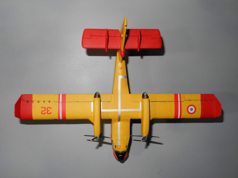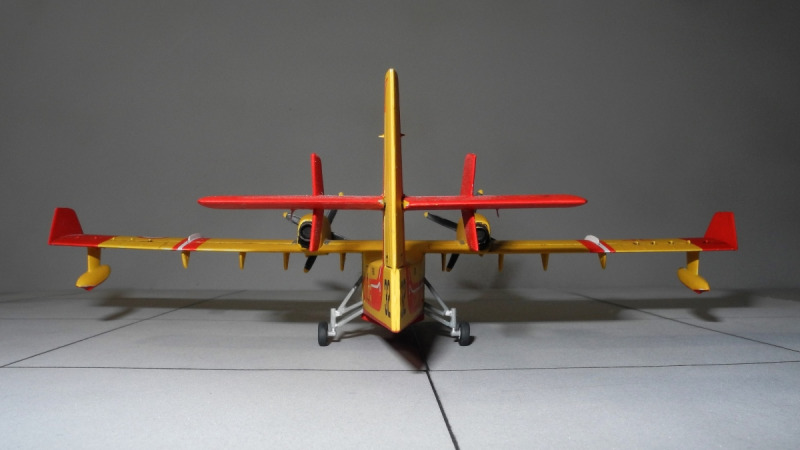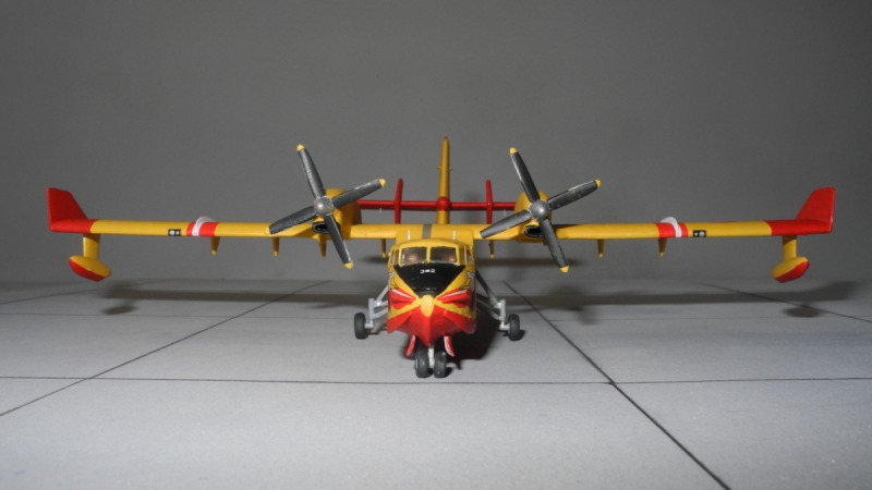 Zum VorbildDie CL-415 war Canadairs Folgemodell für die CL-215, die noch mit Kolbenmotoren von Pratt & Whitney ausgerüstet war. Diese wurden ersetzt durch zwei Propellerturbinen Pratt & Whitney Canada PW123AF mit je 2.380 WPS. Es wurden außer den Triebwerken auch deutlich erkennbare Änderungen an Trag- und Leitwerk vorgenommen. Über 6.000 Liter Wasser können durch Öffnungen an der Rumpfunterseite bei einem dem "Durchstarten" ähnlichen Manöver auf einer geeigneten Wasserfläche aufgenommen werden. Weitere technische Daten und die Entwicklungsgeschichte findet man u.a. auf Wikipedia.