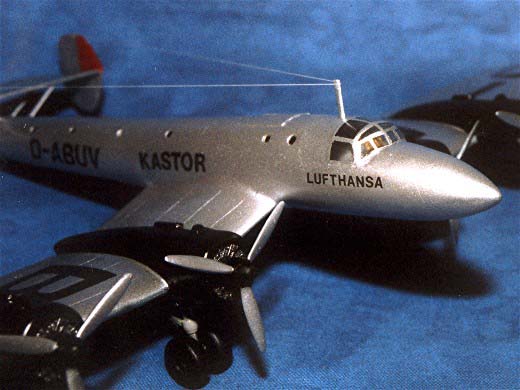 Danach wurden die kleinen Bullaugen auf dem Rumpfrücken mit Klarlack geschlossen. Die Beschriftung erfolgte mit Letrasetbuchstaben, die auf Decalfolie aufgerubbelt wurden. Zum Schluß noch die Antennendrähte aus gezogenen Gussästen und fertig. Wieder ein Modell mehr für unsere Museumsvitrinen.