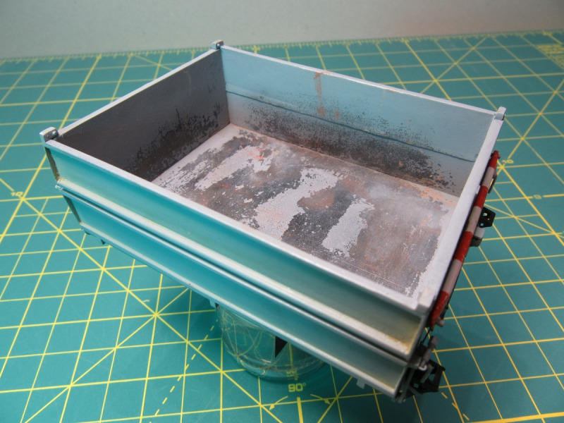 Die Ballonreifen des Modells habe ich gegen Reifen von DEF Model ausgetauscht. Die Reifengröße und das Profil passten so ziemlich mit den originalen des W50 überein. Ich musste nur die Felgen austauschen. Da der W50 in Nordhausen fuhr, bekam er auch ein Thüringer Kennzeichen aus der damaligen Zeit, wobei ich nicht mehr genau weiß ob es genau das meines Vaters Lkw war. Eine andere Reserveradhalterung, und die Pritsche musste ich von einem Dreiseiten-Kipper in einen Zweiseiten-Kipper umbauen. Das hieß, die Front- und Heckplanke sowie die Seitenplanken mussten erhöht werden. An der Front- und Heckseite und unterhalb kam dann noch die Seilzugautomatik zum Öffnen der Seiten beim Ankippen der Pritsche hinzu.