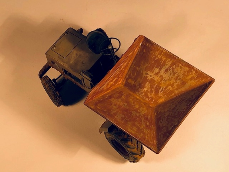 Auf den Bau will ich im Detail nicht weiter eingehen, da er nicht sonderlich schwierig war. Die einzigen zu lösenden Probleme lagen in der Gestaltung der Funktionen der Mulde, die sich nach allen Seiten kippen lässt. Ich baute die Mulde so nach, dass sie sich zumindest in drei Richtungen, nur nicht nach rechts kippen lässt. In der Mulde wurden Gebrauchsspuren dargestellt, zusätzlich aber für das Diorama auch eine Beladungsattrappe geschaffen, die aber abgenommen werden kann.