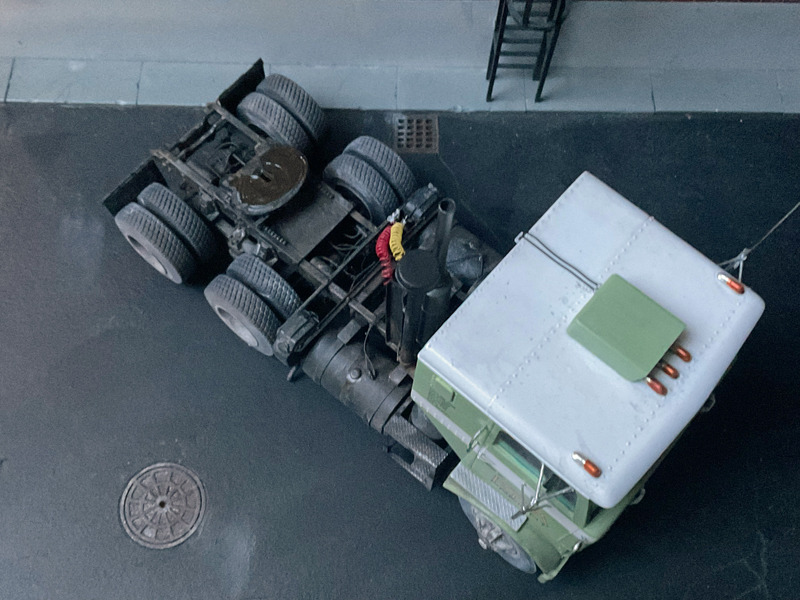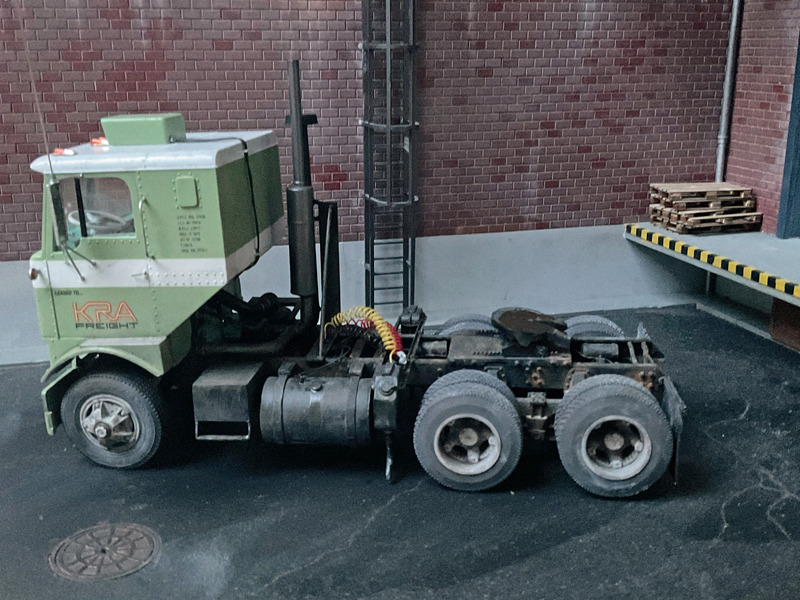 Als Motor wollte ich eigentlich einen Detroit Diesel 6-71 Reihensechszylinder verwenden, aber leider war der nicht zu bekommen. Somit verwendet ich den V6 Detroit Diesel 6V71 Kit mit Getriebe von Strato Models. Das Getriebe des Kits passt eher zu einem Conventional als zu einem COE, so dass ich dieses gegen ein Fuller 13 Gang Roadranger für eine COE tauscht. Druckluft- und Dieselleitungen am Rahmen, Motor und Getriebe wurden zusammen mit verschiedenen Ventilen und Verschraubungen von CTM dargestellt. Die Sattelplatte aus einem amt Bausatz wurde um die Verriegelung und neuen Zahnstangenprofil aus dem Drucker verfeinert. Die Leitungen mit den Kupplungen zum Trailer sind von CTM. Damit Trailer und Truck leichter verbunden werden können, wurden 1x1 mm große Magnete an den Kupplungsstücken verwendet. Lackiert wurde alles mit Farben von Zero Paints. Bei Zero Paints gibt es neben dem Detroit Diesel Green auch Farbtöne für Caterpillar, Ford, GM, Chrysler Motoren. Die Alterung erfolgt mit verschieden Farbtönen, Pigmenten und Washes von AMMO bzw. AK Interactive.