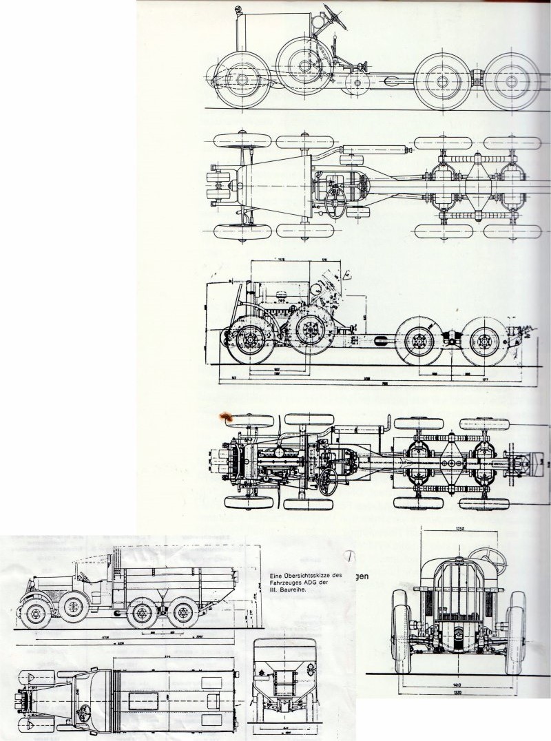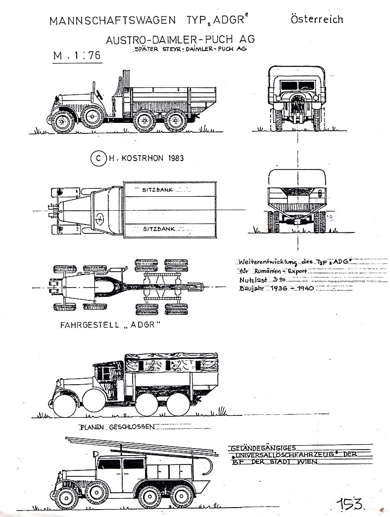 Zum VorbildADG stand für Austro-Daimler Geländefahrzeug, einem dreiachsiger Lkw, der auch als Zugfahrzeug geeignet war. Und ADGR war eine Weiterentwicklung des ADG, die für Rumänien gedacht war. Ein kurzer Film aus den Dreißigern zeigt den ADG in Fahrt, insbesonders auch die Funktion der Pendelachsen.