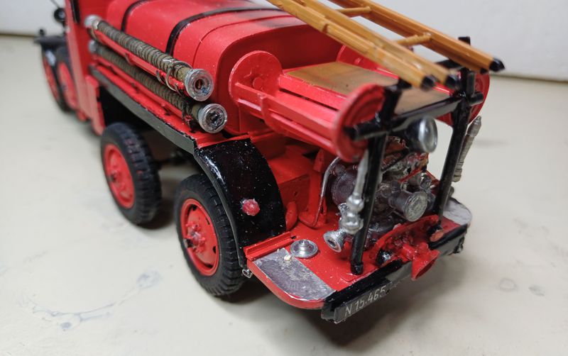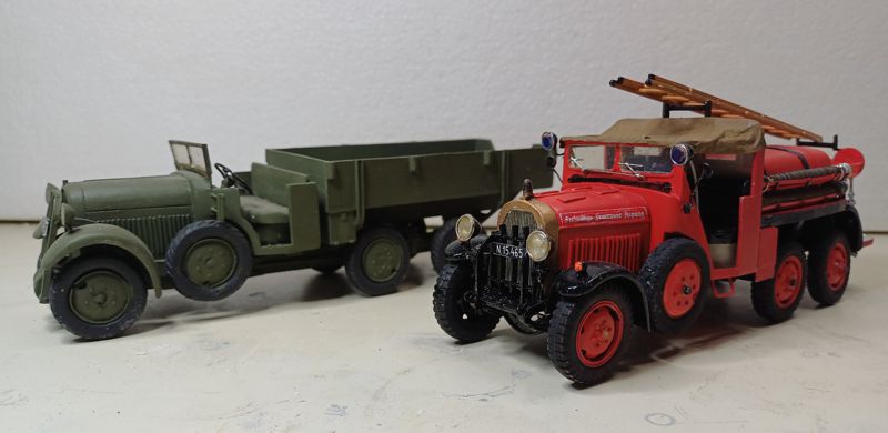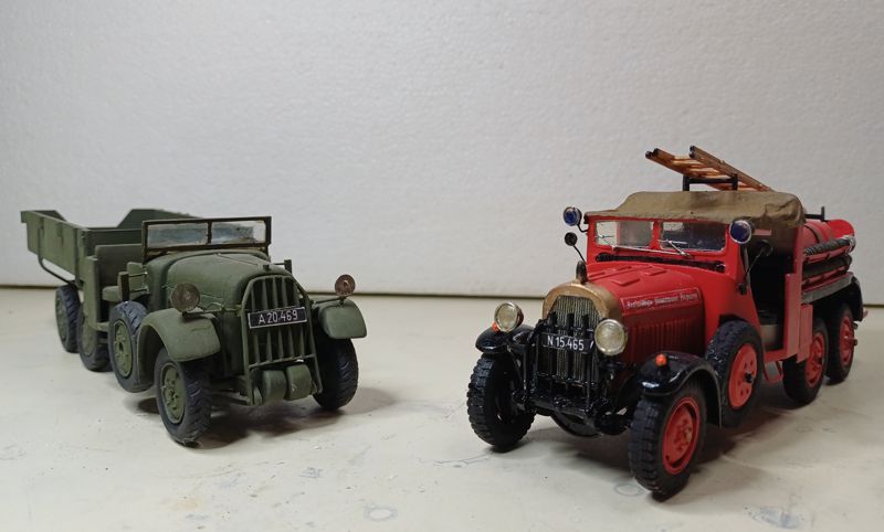 Das damalige Mekka des Plastikmodellbaues in Wien, Hobby Sommer in der Neubaugasse, bot diese Pläne ebenfalls wohlfeil. Außerdem ist bei Spielberger ebenfalls ein Plan des ADG mit Maßangaben vorhanden. Ein Anruf beim Kommandanten der FF Aspang genügte und ich bekam einen Fototermin, an diesem Tag war auch das Team von „Brand aus“ anwesend, welches den Artikel verfasste, wobei ich zum Fachsimpeln Gelegenheit hatte. Somit stand dem Bau nichts mehr im Wege. Warum aber das Fahrzeug hinten einfach bereift war, konnte man mir nicht sagen. Fertig, aber noch nicht voll ausgerüstet