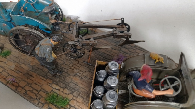 Den Kasten für die Milchkannen habe ich als Eigenbau aus der Restekiste hergestellt. Der Pflug entstand aus einem Umbau von einem alten Britains-Pflug, den ich günstig im Internet ersteigert habe. Alle Tiere stammen von Tamiya.