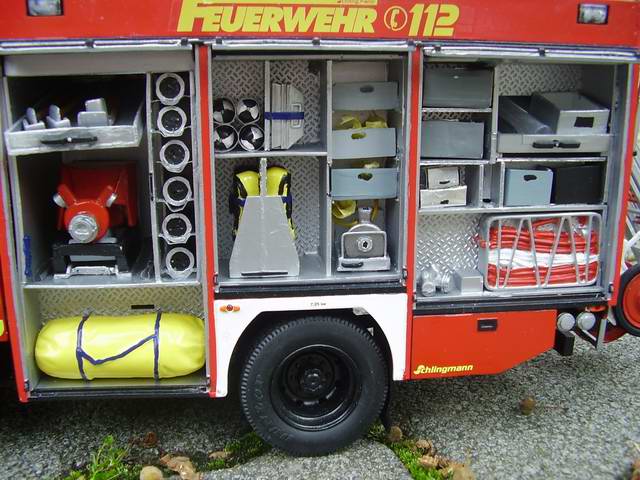 Zum ModellDer Bau begann am 5.1.2008 mit der Zusammensetzung des Rahmens. Eine Woche später kam ich auch endlich dazu das Fahrzeug mal ausgiebig im Original zu betrachten, nach dem ich es einmal an mir vorbei fahren sah und den Mund nicht mehr zu bekommen hatte. Zu dem ist das Modell vollständig mit Licht ausgestattet, alle Zusatzteile und Umbauten der Geräteräume wurden nach Original Bilder gemacht und in Eigenleistung. Es wurden Sachen auch zusätzlich umgebaut und funktionstüchtig gemacht, wie die Haspel und die Leitern.Weitere Bilder