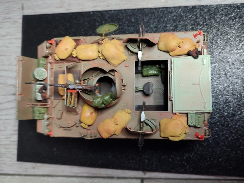Der Bausatz ist von AFV Club in 1:35, so wie er da steht, kommt er direkt aus der Schachtel. Die Sandsäcke, Stiefel etc. sind aber Zubehör von PlusModel und werten das Modell meiner Meinung doch auf und bringen etwas Realismus. Der Bausatz an sich ist gut zu bauen, allerdings passen Unterwanne und Dach nur mit etwas Druck zusammen. Ansonsten liegen jede Menge Teile für diverse Waffen-Optionen bei, auch sind Figuren enthalten, die bei mir allerdings noch in der Bemalung sind. Lackiert ist, wie üblich bei mir, mit Ammo of Mig Farben, diesmal aus dem Set Smart Set Vietnam, und eingestaubt mit Pastellkreide aus dem Bastelladen.