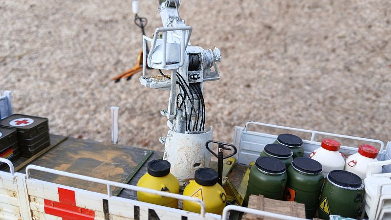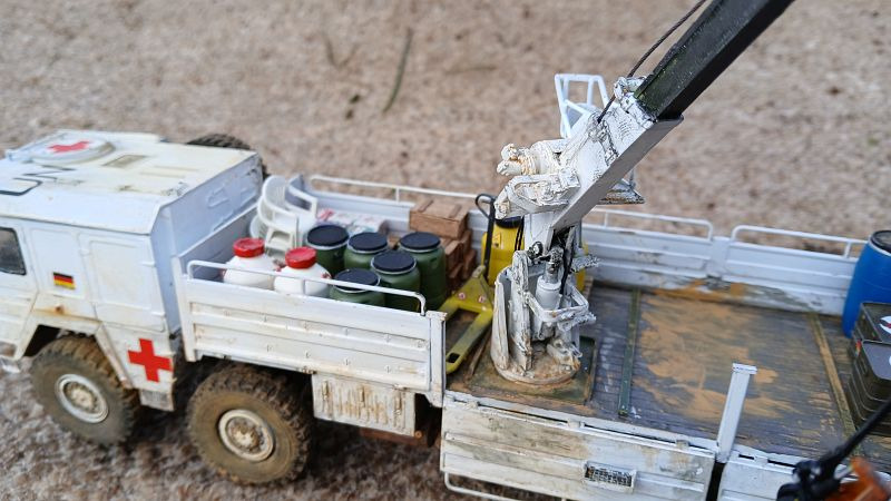 Die Ladefläche bekam einen verwitterten braungrauen Anstrich. Verschmutzt wurde das Modell sehr dezent mit sandgelben Pigmenten. Als Ladegut wurden verschiedenste Zubehörteile von Mini Art und anderer Hersteller verwendet.