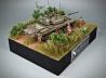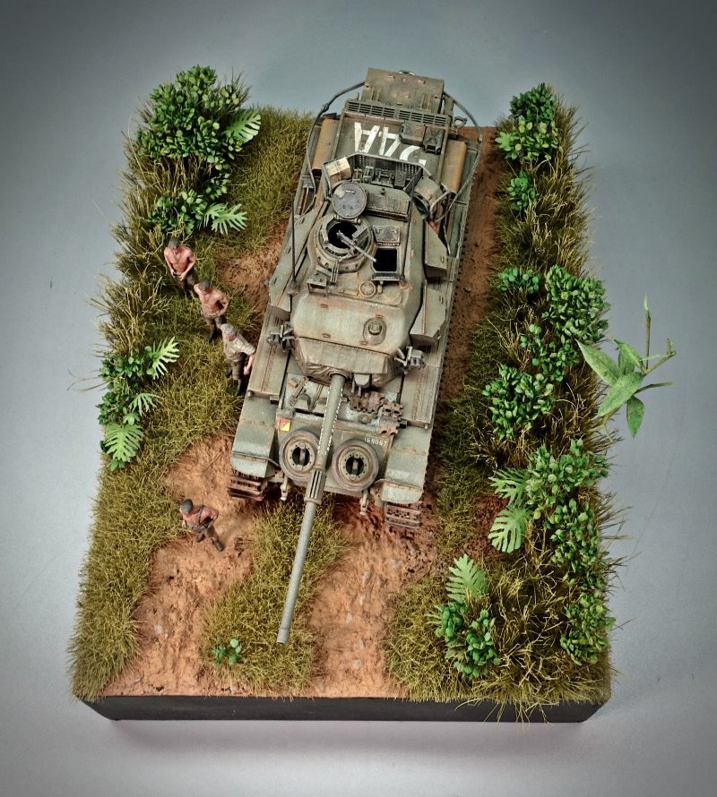 Zum Begrasen nutzte ich einen Beflocker und ca. 6,5 mm langes Statikgras. Dabei wurde das Statikgras mit einem stark verdünnten Holzleim-/Wassergemisches fixiert. Anschließend setzte ich im Randbereich höheres Gras, sowie tropische Pflanzen und Blätter aus dem allgemeinen Dioramenzubehörbereich. Als nächstes folgte die farbliche Anpassung, da bis dato alles noch sehr künstlich und aufgesetzt wirkte. Dabei nutzte ich die Airbrush und verschiedene Grüntöne. Anschließend arbeitete ich mit unverdünnter Ölfarbe und Pinsel weiter. Hier kamen nun sehr helle Grüntöne zum Einsatz, mit denen ich Hauptsächlich die Spitzen der Gräser und Ränder der Pflanzen/ Blätter bearbeitete. Am Schluss war es dann wieder Zeit für das Tamiya Buff, mit dem ich das ganze Diorama leicht übernebelte. Mit der Anbringung eines passenden Typenschildes waren dann auch hier die Arbeiten abgeschlossen.