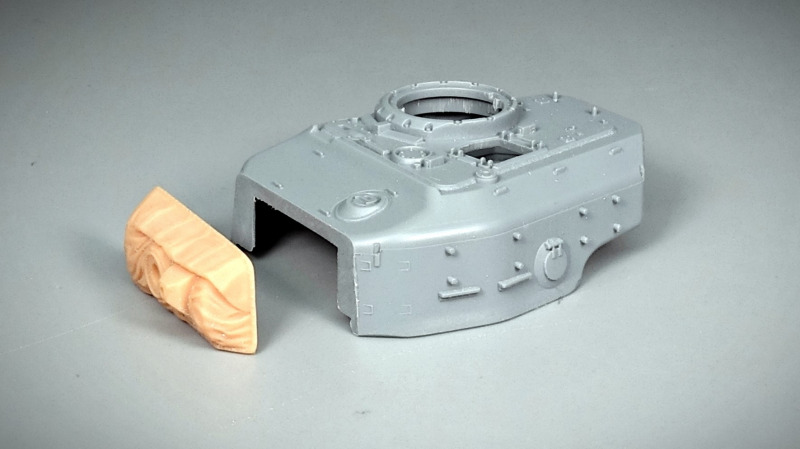 Da der Bausatz wirklich sehr detailliert mit vielen Kleinteilen ausgeführt ist, konzentrierte ich mich auf die jeweilige Baugruppe von Turm und Rumpf, um nicht den Überblick zu verlieren. Am Turm gestaltete ich die Luken im geöffneten Zustand, doch vorher mussten hier noch leichte Schleifarbeiten vorgenommen werden, um das beiliegende 3D-Druckteil der Geschützblende anzupassen, worauf Vespid in der Bauanleitung aber auch genau eingeht.