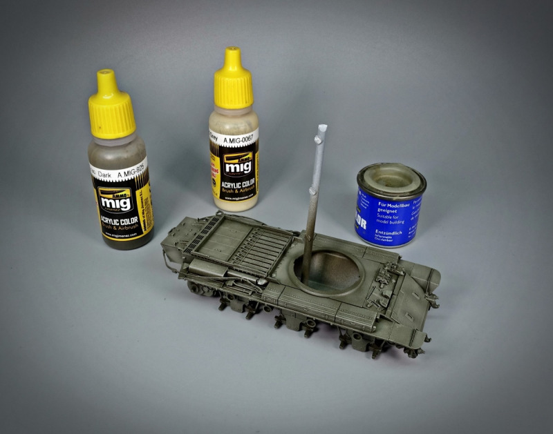Den Anfang machte hier eine dunkle Grundierung. Anschließend bildete ein Olive Drab von Ammo/ Mig (A.MIG-925) meine Basis. Dieses Olive Drab hellte ich in zwei Stufen mit einem Sand Grey (A.MIG-0067) immer weiter auf, wobei der zweite Stufenauftrag nur noch sehr dezent erfolgte. Zu guter Letzt folgte ein kräftiges Drybrushing mit einem hellen Oliv (Revell 45).