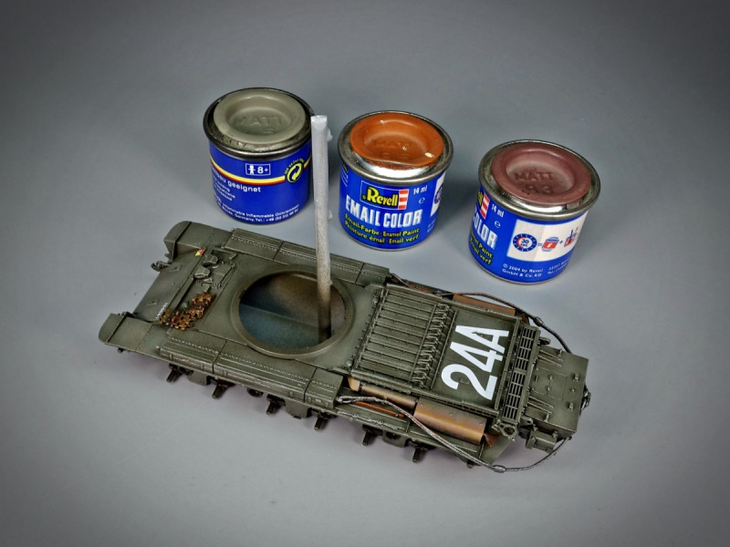 Um nun eine glatte Basis für die Decals und folgende Alterung zu bilden, erhielt das ganze Modell einen Überzug mit einem Acryl-Glanzklarlack (Vallejo 70.510 Gloss Varnish). Bei den Decals entschied ich mich für die Option 5, die sich auf die Phuoc Tuy Provinz (südlich von Saigon) in Vietnam 1969 bezog. Dabei kam gerade auf dem oberen Heckbereich bei der großen Kennnummer viel Weichmacher (Revell „Decal Soft“) zum Einsatz, um eine enge Anschmiegung der Decals an den Fugen und Verschlüssen zu garantieren. Nach getaner Arbeit und ausreichender Trockenzeit wurden nun die Bereiche mit den aufgebrachten Decals nochmals mit dem Acryl-Glanzklarlack versiegelt. Alle weiteren Arbeiten erfolgten nun mit dem Pinsel. Zu Anfang wurden dabei alle nötigen Kleinteile wie Werkzeug, Laufrollen, Abschleppseile etc. bemalt. Auch erhielten die Schutzbleche der Auspuffanlagen eine passende Bemalung mit Rosttönen. Dabei griff ich als Hauptkomponenten auf Revell 83 Rostmatt und Revell Braunmatt zurück. Nun kamen mit einem Dark Rust und Light Rust von Abteilung 502 Ölfarben zum Einsatz. Hier bearbeitete ich hauptsächlich die Stellen, die auch beim Original starker Abnutzung ausgesetzt waren. Dabei wurden die Ölfarben nur leicht verdünnt sehr dezent an den besagten Stellen aufgebracht und mit einem kurz geschnittenen Pinsel leicht verrieben und/ oder wieder ein wenig entfernt, wenn der Effekt zu extrem war. Bei vertikalen Stellen strich ich dabei den kurzen Pinsel vertikal von oben nach unten, um so leichte Rostschlieren zu imitieren. In ähnlicher Form ging ich auch bei den Wetterschlieren vor, wobei hier verschiedene Grün- und Grautöne (ebenfalls Ölfarben) zum Einsatz kamen. Nach ausreichender Trochnungszeit war es nun Zeit für ein punktuelles Washing, bei dem ich das Dark Wash von MIG nutzte. Auch hier ließ ich das Modell anschließend wieder einen Tag durchtrocknen, bevor es nun an das finale Drybrushing ging. Dabei griff ich wieder auf Email-Farben von Revell zurück. Den Anfang machte das schon vorher genutzte Hell Oliv (Revell 45), welches ich dieses Mal dezenter aufbrachte und damit selbst schon bearbeitete und nun leicht abgedunkelte Stellen wieder etwas mehr betonte. In gleicher Weise arbeitete ich mit dem Revell 89 (Beige matt) und 75 (Steingrau), wobei ich die Farben so einsetzte, dass diese farblich mit dem jeweils dunkleren Grundton harmonierten. Zu guter Letzt setzte ich mit dem Tan for Tritional Camo von MIG (F242) nur einen Filter über das ganze Modell, um damit eine allgemeine Harmonisierung aller Farben zu erzielen. Den Abschluss bildete ein mattes Finish mit dem Vallejo-Mattlack 26.702.