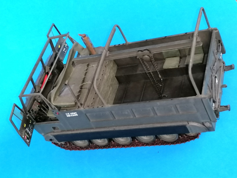 An der Fahrzeugfront habe ich die Winde detailliert und sämtliche Werkzeughalterungen samt Zurrösen leer dargestellt. Die Scheinwerfer erhielten tiefgezogene Azetat-Gläser. Die Türen der Kabine wurden ausgeschnitten und mit funktionierenden Scharnieren und Schiebefenstern versehen. Die Öffnungsketten sind aus isoliertem Draht, die Schließ-Schlaufen aus Durchschlagpapier, die Markierungen vom AFV Club "Chaparral". Der Unterbau des Fahrersitzes wurde neu gestaltet, alle Sitze erhielten Kissen aus Seidenstoff; Gurte habe ich nicht gebastelt. Vor dem Fahrer mussten die Lenkhebel fürs Drehen auf der Stelle ergänzt und die anderen Bedien-Instrumente detailliert werden. Die "Gummimatten" auf dem Boden stammen von Sektflaschen.