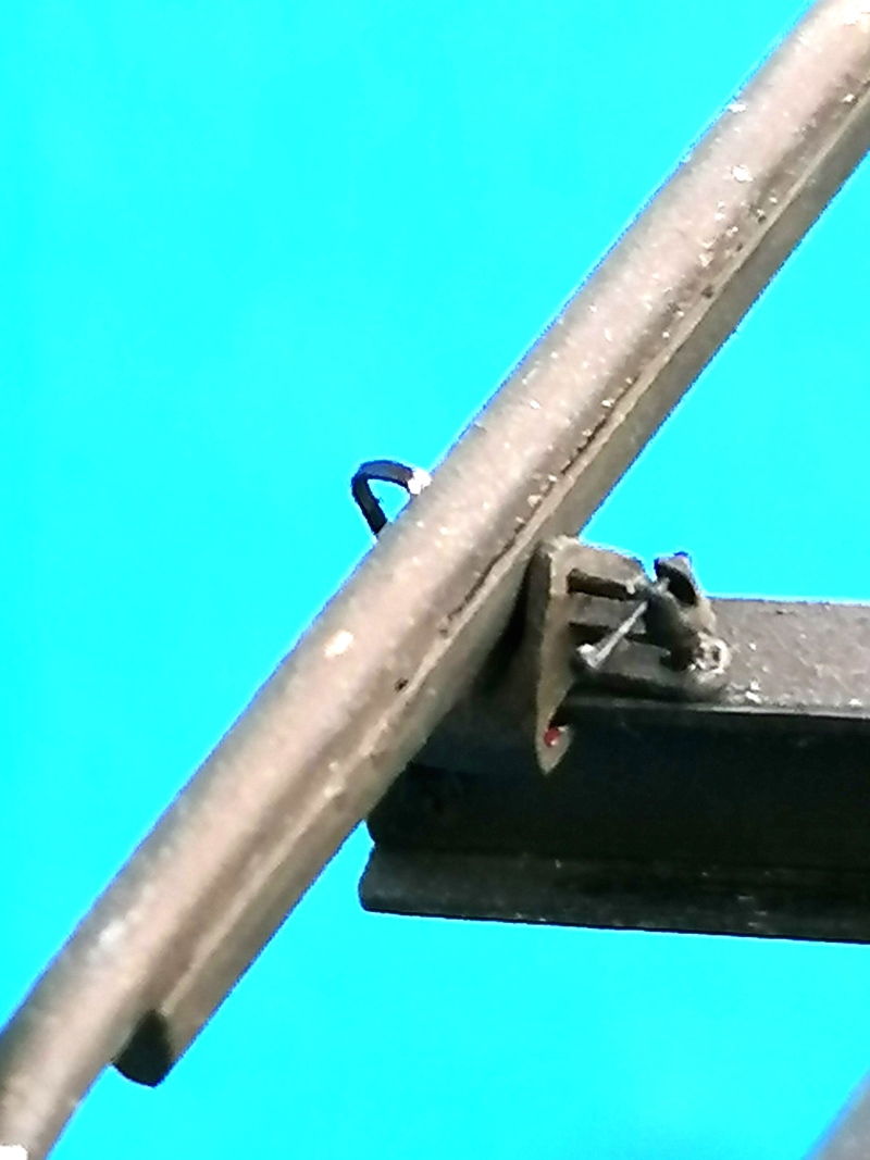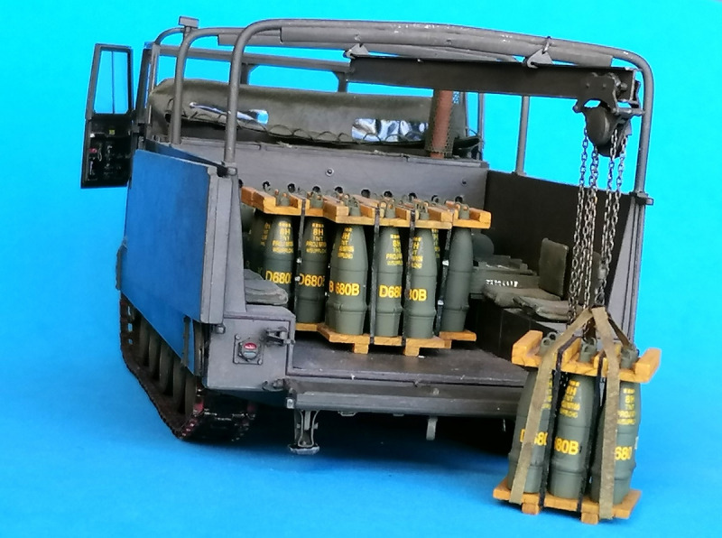 Das Ladegeschirr ist ohne die Plane nicht mit Bausatzmitteln zu verwenden – und wenn man die benutzt, ist der Doppel-T-Träger nur in der Arbeitsposition einzubauen. Im Original wird er von zwei Spriegeln getragen, an denen er seitlich versetzt werden kann, und beim Marsch wird er über das Motordeck nach vorn geschoben, damit er hinten nicht übersteht. Ein neuer Träger von 3 x 5 mm erhielt zwei Spriegel aus Regenschirm-Speichen mit 2 mm hohen Unterbauten, die je drei Bohrungen in der Mitte und an den Seiten haben. Durch die gehen die Stifte, die die Halter des Trägers arretieren. Damit kann der mittig, seitlich und schräg installiert werden. Das Hebegeschirr musste auch weiter detailliert werden. Die Ladegurte sind wieder mal aus Seide. Die 203 mm-Munition ist von AFV Club, die drei Zünder-Kisten von mir, ebenso die vier Sitze.