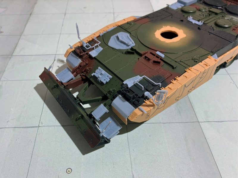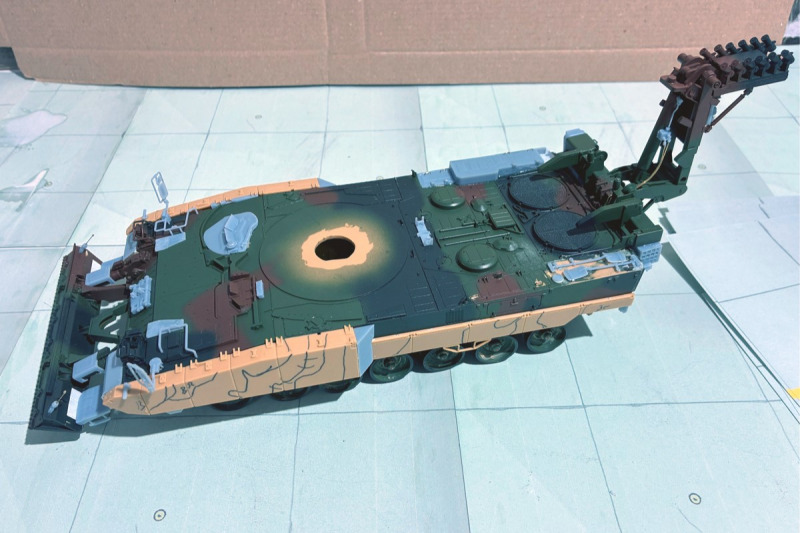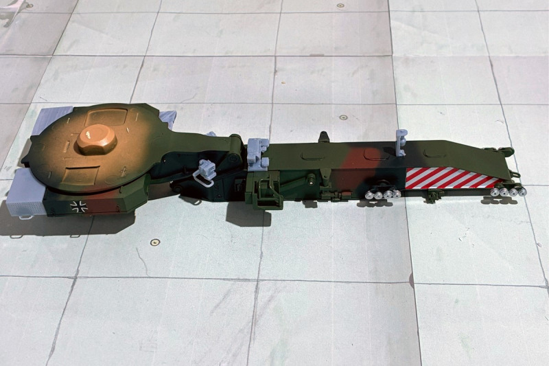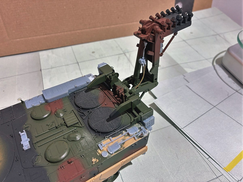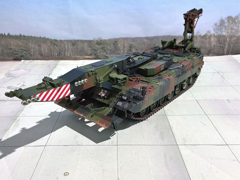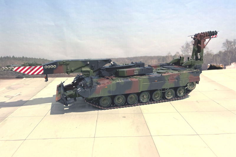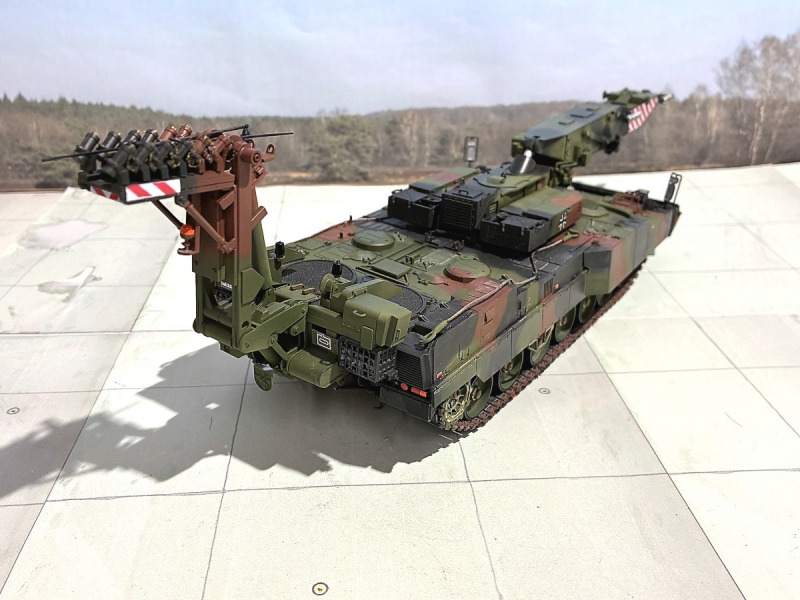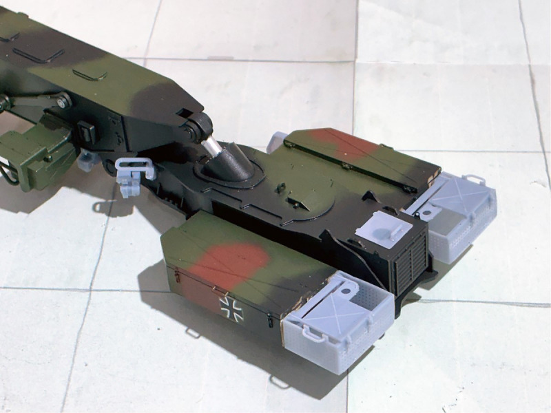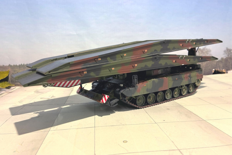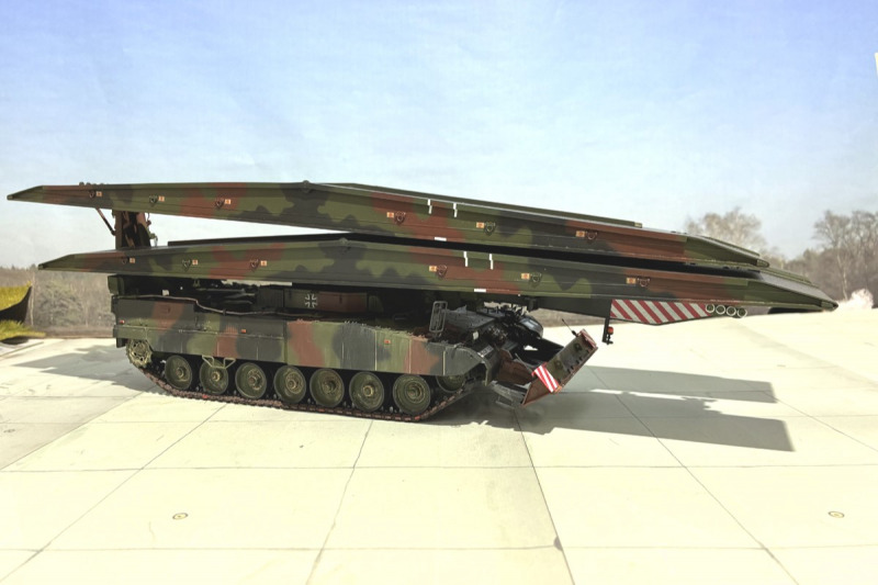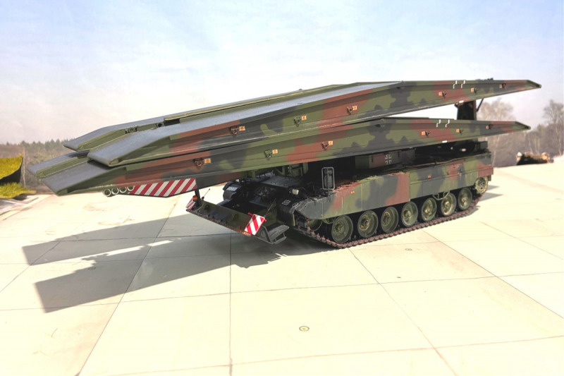 Ich hatte das Modell fast fertiggestellt, ohne großartig zu recherchieren. Dann stieß ich aber auf einen Ergänzungssatz von MAD Modellbau. Nun fing ich an, mal anhand von Bildern die Richtigkeit des Modells zu überprüfen. Wow, das Modell stimmte mit der aktuellen Version in vielen Details kaum überein. Es handelt sich bei dem Bausatz schlichtweg um ein Vorserienmodell. Die Überlegung, ob es sinnvoll ist, den Ergänzungssatz in ein fertiges Modell einzubauen: ok, Risiko. Ich bestellte zwei Sätze und fing an, die 3D-Teile ein- und anzubauen. Etwa 95 % der Teile konnte ich verwenden, ohne das Modell zu sehr zu beschädigen. Meine Sätze von MAD wiesen Höhen und Tiefen auf, aber letztlich hat es sich gelohnt, den Umbau zu wagen. Das Modell ist aber nach der Verwendung des Ergänzungssatzes immer noch nicht hundertprozentig. Besonders die Positionen der Schäkel an den Brücken stimmen mit dem Original nicht überein. Die Farben stammen von Tamiya. Die Decals sind unvollkommen, die Nummernschilder zu groß. Für die 2 × 14 Meter-Brücke müsste man ein MLC-Decal 71 verwenden. Ich habe mir einige Decals selbst erstellt und angebracht, was das Modell noch einmal ein bisschen aufwertet. Auf übermäßige Alterung verzichte ich - nur etwas an den Seiten und Laufrädern. Nachfolgend Bilder des Einbaues.