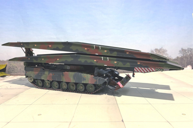 Panzerschnellbrücke Leguanvon Jost Schreiber (1:35 verschiedene Hersteller)Die PSB Leguan im OriginalDer Brückenlegepanzer Leguan ist eine leistungsgesteigerte Weiterentwicklung des Bibers. Er wird in zwei Varianten mit einer 26 m- oder zwei 14 m-Brücken ausgeliefert. Die Brücken werden im horizontalen Verfahren verlegt, der taktische Vorteil liegt dabei in der beim Verlegevorgang niedrigen Fahrzeugsilhouette. Die zweigeteilte 26 m Brücke wird analog wie die Brücke des Bibers verlegt. Beim Einsatz der 14 m-Brücken führt der Leguan zwei einteilige Brücken mit und kann jeweils eine nach der anderen verlegen. Um breitere Hindernisse zu überbrücken, können die Brücken überlappend verlegt werden.