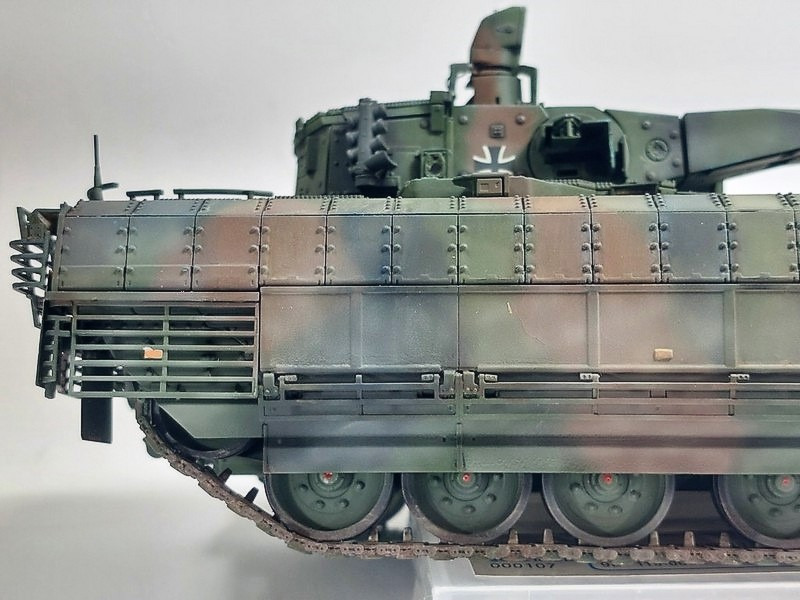 Dieses Modell des Schützenpanzers Puma im Maßstab 1/35 enstand aus dem wirklich sehr guten Bausatz der Firma Rye Field Model. Einziges hinzugefügtes Bauteil ist das Abschleppseil. Dieses entstand aus verdrillter Kupferlitze.