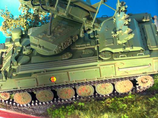 SAM-6 ist ein Luftabwehrsystem für niedrige Höhen. Das erste Mal wurde er 1967 in Moscaw gezeigt. Die Raketen haben eine Reichweite von 4000 bis 24000m. Die Einsatzhöhe liegt zwischen 100 und 14000m. Der Bausatz von Trumpeter lässt sich ohne Probleme zusammenbauen. Die Passgenauigkeit ist vorbildlich. Die Ketten bestehen aus längeren Segmenten und Einzelgliedern. Das Modell ist aus dem Kasten gebaut. Spachtel wurde nicht gebraucht. Lackiert wurde mit Farben von Humbrol und Revell.
