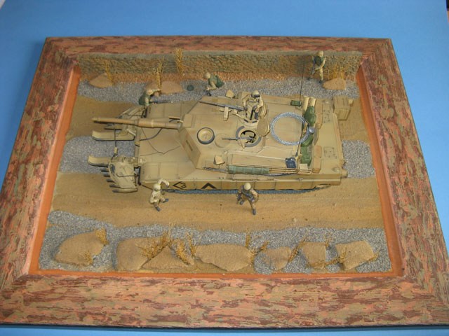 Es handelt sich wohl um den bekanntesten Kampfpanzer unserer Zeit! Das M1A1Abrams-Modell ist von Tamiya (#35158) und ein hervorragender Bausatz, der keine Wünsche offen lässt! Nur beim Zusammenbau des Pfluges sollte man etwas Zeit investieren und aufpassen, am Ende ist er sogar beweglich. Sehr schön bei dieser Variante des A1 ist, dass sich im hinteren Teil ein Hilfsgenerator (APU) befindet. Die Army lässt sich mehr oder weniger phantasievolle Namen und Schriftzüge einfallen, und somit wurde dieses Exemplar auf „Bakterie" getauft. Die beiden großen Augen passen wohl auf, dass sie zwischen den Zähnen keine Mine erwischen.