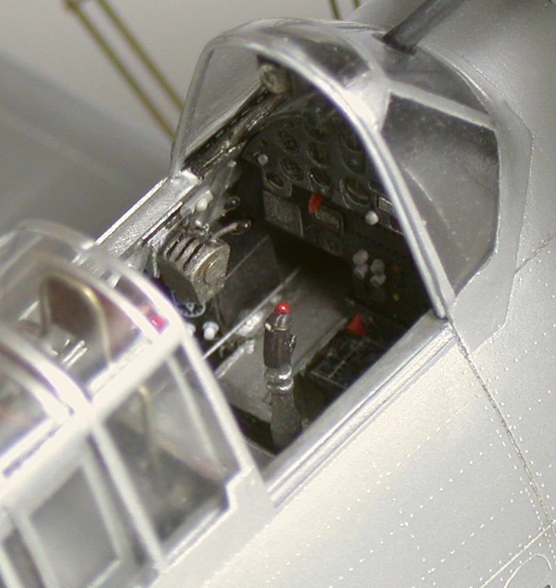 Ein Stückchen von einem rechteckigen Plastikstab (1,5 x 1,5 mm), ein Instrumentendecal sowie ein geätztes "Bezelelement" von Reheat ergeben einen Kompass. Die Führungsschienen für die Schiebehaube entstammen dünnen Plastikstreifen. Auch bei diesem Projekt konnte ich mir nicht verkneifen, den Nietenroller in Ruhe lassen: die Oberfläche gewann durch die Nieten ungemein an Lebendigkeit.