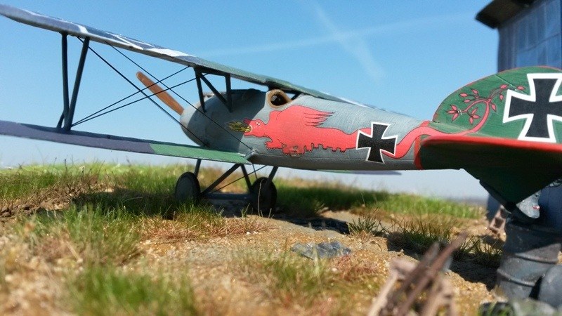 Zum Bau:Gebaut wurde die Maschine aus dem Eduard Weekend-Pack größtenteils aus der Kiste. Die Qualität und Passgenauigkeit des Kits lässt keine Wünsche übrig. Das Cockpit wurde durch Anbringung eines Gurtes (Klebeband) und Seilzüge für die Lenkung (gezogene Gussäste) ein wenig aufgewertet. Der Zusammenbau gestaltete sich als völlig problemlos. Bemalt wurde die Maschine mit matten Revellfarben und dem Pinsel. Viele Details, die eigentlich als Nassschiebebilder beinhaltet waren, wurden mit Farbe und Pinsel am Flugzeug angebracht. Die Qualität der Decals war, wie beim Konkurrenten Revell auch, einwandfrei. Der Kit gibt leider nur die Möglichkeit das hier gezeigte Flugzeug darzustellen. Die Verspannung erfolgte mit gezogenen Gussästen und ging relativ einfach vonstatten. Bei der Holzdarstellung des Propellers wurde auf die Tipps von Thomas Weber "Realistische Holzdarstellung" (siehe Modellversium > Tipps und Tricks > Bemalung) zurückgegriffen. Anschließend folgte eine Alterung des Modells mit matten Revellfarben und dem Trockenmalverfahren.