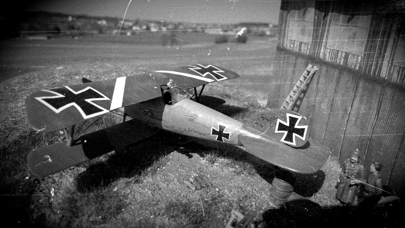 Das Diorama:Das ca. 7x12 cm große Diorama zeigt eine Szene im Jahre 1914, bei der Richard Flashar im Gespräch mit einem General die Vor- und Nachteile der neuen Albators D.V erläutert. Währenddessen kümmert sich ein weiterer Soldat darum, dass die Maschine für den nächsten Einsatz klar gemacht wird. Der Displayboden besteht aus einer Mischung aus Vogelsand, Revellfarbe und Weißleim. Diese klebrige und zähflüssige Masse wurde anschließend auf den Karton gestrichen. In die noch nasse Mischung wurden zahlreiche Reifenspuren geritzt. Ebenso wurde langfasriges Streugras in die Masse gesteckt. Zahlreiche Gegenstände detaillieren die Szene zusätzlich. Die Leiter stammt von Preiser, die Fässer von Italeri, die Gewehre von Preiser und ICM, die Speichenräder von RPM und die zahlreichen Querruder von alten Revellmaschinen. Der Soldat und der General stammen von Airfix und sind nicht sehr gut detailliert. Viele Details mussten nachgeschnitzt werden. Der Pilot besteht aus Resin (von CMK) und ist von hervorragender Qualität. Die Figuren wurden mit matten Revellfarben und einem dünnen Pinsel bemalt. Die Maschine sollte in einem aufgebockten Zustand dargestellt werden, um einen freien Blick auf den Drachen, der die ganze Seite der Maschine schmückt, in seiner vollen Größe zu zeigen. Fazit:Der Bau dieser alten Kisten macht sehr viel Spaß, vor allem wenn der Kit so passgenau ist, wie es die Bausätze der Firma Eduard sind. Sicherlich bleibt dieser Doppeldecker nicht die letzte alte bunte Kiste in meiner Sammlung. Mit jedem gebauten Flieger geht die Verspannung der Tragflächen einfacher und schneller von der Hand. Dennoch ist diese "Fuselarbeit" nicht für Modellbauneulinge zu empfehlen. Ich hoffe es gefällt!